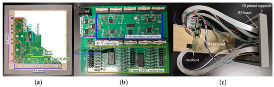 (a) RF board of the K-band 3D MIMO radar; (b) baseband board; (c) photo of the fully assembled 3D MIMO radar prototype [].