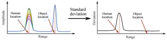 It is quite easy for an FMCW radar to differentiate a moving target from stationary clutters. However, it is quite challenging to discriminate a stationary living target from other stationary objects. On the other hand, for living targets, such as human subjects, some special properties can be observed from the FMCW radar signal. When a human subject is standing or sitting still, his or her vital activities, such as respiration and heart beat, introduce significant variations in the amplitude of the reflected radar signal. This kind of effect is also referred to as the “vital-Doppler” effect []. Figure 14 shows the signal processing procedure life tracking with “vital-Doppler” effect. Firstly, multiple measurements are obtained for processing. Due to the “vital-Doppler” effect, the range profiles of a human target at different measurements have significant variations; however, the measured results for a stationary target are very stable. If the standard deviation of the range profiles of these different measurements is calculated, a peak will appear at the location of the human subject. Thus, the human subject can be discriminated from other stationary objects. This method has been applied in the experiment shown in Figure 11b to discriminate the human target. Figure 15 shows the 2D mapping results of human target discrimination with vital-Doppler effect. It can be clearly seen that the signatures of the stationary targets are minimized and the signature of the human subject is discriminated.