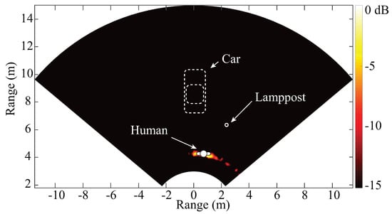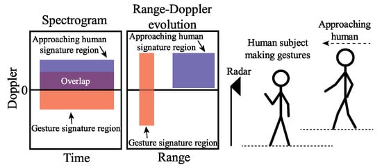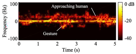 Cameras and complex image-processing algorithms have been used in advanced human–machine interface []. However, optical camera based solutions and their algorithms have a very high demanding for computational resources and are sensitive to ambient light. These two issues hinder the use of camera-based gesture recognition, especially with portable devices with limited computational capabilities. Doppler radar sensors show promising performance in detecting motion properties of targets []. Simple algorithms, such as time-frequency analysis, can be used in human gesture recognition. The advantages for a Doppler radar in gesture recognition include high integration, low demand for computational resources. However, one of the major issues for Doppler radar is that it is unable to separate motions from multiple moving targets. On the other hand, FMCW radar provides range information from targets, which help to separate motions from targets in different ranges. FMCW radar can have almost the same hardware architecture as Doppler radar, and its signal processing is a little more complex than that of a Doppler radar. However, compared with camera based solutions, FMCW radar still requires much less computational resources. Figure 16 illustrates a complex case when two targets are present in the field of view of an FMCW radar at the same time []. For the two targets, one human subject is making gestures, and, at the same time, the other person is walking toward the radar. With a Doppler radar with time-frequency analysis, the signatures of the two moving activities are overlapped, which makes it extremely difficult to separate. However, with an FMCW radar, it is straightforward to separate the two targets based on their different ranges. Then, the moving properties of the two different targets can be analyzed based on their micro-Doppler and micro-range signatures. The experiment has been performed with a portable 5.8 GHz Doppler radar prototype and a 5.8 GHz FMCW radar prototype. The experiment results match well with the analysis. The Doppler radar failed to separate the two motion signatures, shown in Figure 17, and the FMCW radar can successfully separate the two targets with different ranges and identify the gesture of one of the subjects by its micro-Doppler and micro-range features, shown in Figure 18.