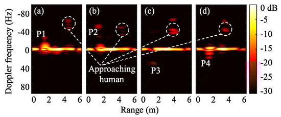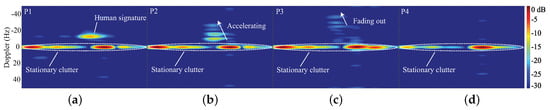 Frames of range-Doppler images during the fall incident. (a) P1; (b) P2; (b) P3; (b) P4 [].