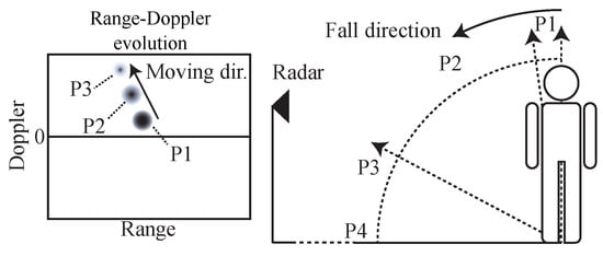 Illustration of a fall accident and the corresponding range-Doppler image evolutions [].