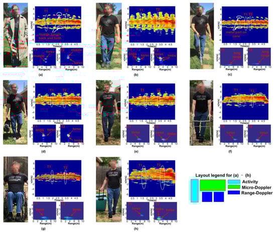 Micro-Doppler and range-Doppler properties of a human subject walking or moving at different conditions. (a) with a concealed rifle; (b) with natural arm swings; (c) with a cane for a blind person; (d) with holding a gym bag; (e) with carrying a laptop; (f) with a walker; (g) moving in a wheelchair; (h) with a rolling suitcase [].
