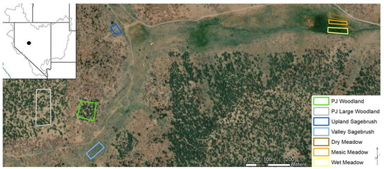 Vegetation is comprised of three main community types: singleleaf pinyon (Pinus monophylla) and Utah juniper (Juniperus osteosperma) woodlands, mountain big sagebrush (Artemisia tridentata ssp. tridentata) shrublands, and high elevation valley bottom meadows. The diverse meadow community was differentiated into three classes based on vegetation type for analysis. The wet meadow consists of Nebraska sedge (Carex nebrascensis) and arctic rush (Juncus arcticus); the mesic meadow has a diverse mix of forbs, arctic rush, and Douglas’ sedge (Carex douglasii). The dry meadow currently has an overstory of mountain and basin big sagebrush (Artemisia tridentata ssp. tridentata) with primarily Douglas’ sedge and povertyweed (Iva axillaris) in the understory. Pinyon and juniper (PJ) are native coniferous evergreen trees. Sagebrush is considered a semi-deciduous evergreen shrub as it retains leaves throughout the year. Vegetation surveys were conducted in 2017 to characterize the plant communities using standard line point intercept methods [38]. The interspace in the pinyon and juniper community had a mixture of bareground (62.6%) and basal cover of forbs and grasses (37.4%), dominant grasses were cheatgrass (Bromus tectorum) and Sandberg’s bluegrass (Poa secunda). Both cheatgrass and Sandberg’s bluegrass are early season grasses with cheatgrass being an annual and Sandberg’s blue grass being perennial. Sagebrush has two sets of leaves: a persistent set that grows in spring and summer and are retained through winter; and an ephemeral set of larger leaves that emerge in spring, but are senesced at the height of the summer dry period with the previous year’s persistent leaves [39]. Artic rush, Nebraska sedge and Douglas’ sedge are perennial species with varying phenologies [40]. Artic rush and Nebraska sedge flower from late May to August with seed ripe typically occurring in August, whereas Douglas’ sedge flowers in May to late June [41]. Povertyweed, a rhizomatous, perennial herb exhibits a wide flowering window. The plant’s bloom period occurs between April and October, primarily in response to moisture availability [41].