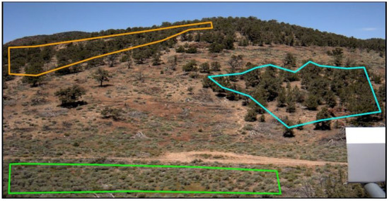 Three phenocams were installed to obtain the land-based imagery and estimates of NDVI for each of the community types in the regions of interest (ROIs) from 2015 through 2017 (Table 1, Figure 2 and Figure 3). The following six ROIs were defined and analyzed: a small PJ woodland site located in the middle of a cutting treatment, sagebrush located on the valley floor (i.e., valley sagebrush), upland sagebrush, wet meadow, mesic meadow and dry meadow (Figure 1, Figure 2 and Figure 3). A seventh ROI was defined to confirm results from the small PJ ROI, this was a larger PJ woodland located upslope of the small PJ ROI (Figure 1 and Figure 2). The description of the three cameras is provided, and includes heights of the cameras, angle mounted from horizontal to the ground surface, azimuth and aspect (Table 1). Commonly used abbreviations are provided in the Supplementary Information (Table S1).