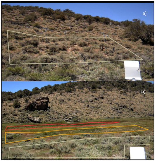 (Panel a) is the region of interest (ROI) for the upland sagebrush camera site, upland sagebrush is outlined in white. (Panel b) shows the three ROIs for the meadow camera site: wet meadow (red ROI), mesic meadow (orange ROI), and dry meadow (white ROI). The dry meadow has experienced historic degradation and has a sagebrush component.