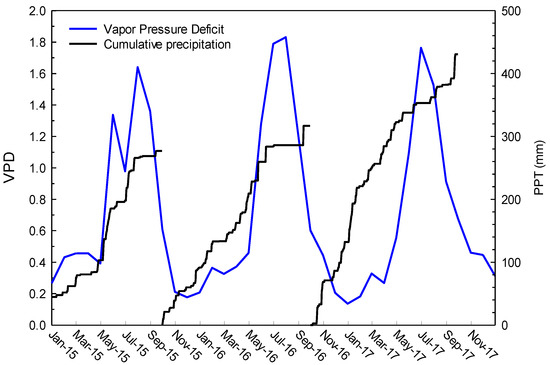Average monthly vapor pressure deficit (VPD, blue line) and cumulative precipitation (PPT, black line) for the water years 2015 to 2017.