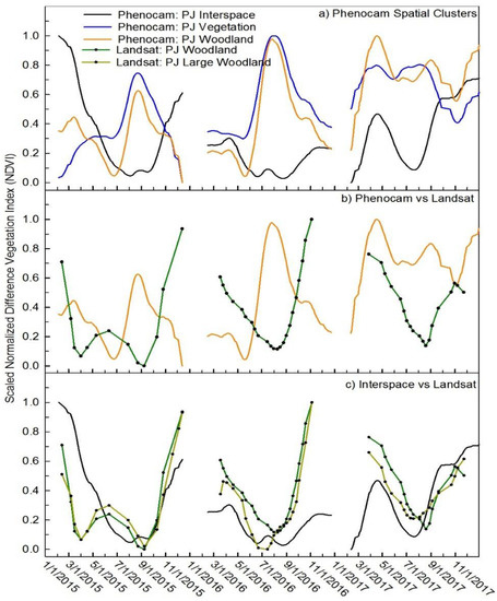 For visual comparison purposes, data used in the figures were rescaled from zero to one across the three years. Variations between years and Landsat versus phenocam are highlighted with this method. To rescale figure data, we took the final NDVI data for each site from both phenocam and Landsat, determined the 3-year minimum, maximum and amplitude, then subtracted the minimum from each data point and divided by amplitude. Values were rescaled for both Landsat and phenocams using Equation (5).