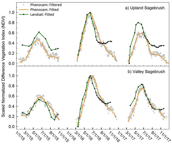 Satellite-derived indices vary on scales of meters to kilometers, and the pixels are representative of a mixture of vegetation types and ground area (i.e., mixed pixels) [20]. MODIS NIR and red reflectance data is at a relatively coarse spatial resolution (250 m × 250 m) and acquired daily (~four days at near nadir view angles), whereas Landsat has finer spatial resolution (30 m × 30 m) but is only acquired every 16 days. In systems with heterogeneous vegetation, finer spatial resolution is necessary for tracking the phenology of distinct community types, and those that are relevant to management. For example, the Great Basin is characterized by north-south trending mountain ranges interspersed with flat, aggraded valleys. Groundwater dependent systems, including meadows and riparian stream corridors, occupy a small fraction of this semi-arid landscape, yet are vitally important sources of water and habitat to sustain biodiversity of plants and animals [34,35]. Mountain ranges in the area often have dramatic elevation gradients and contain steep, narrow canyons, leading to heterogeneous vegetation. Given the need for relatively high spatial resolution to track phenology of distinct vegetation types, we relied on Landsat since it has sensor continuity and adequate spatial and temporal resolution, to explore the amount of agreement between Landsat-based NDVI and phenocam-based NDVI. Leveraging the multi-decadal record of Landsat NDVI, while combining these data with increased spatial and temporal resolution phenocam NDVI can potentially aid in enhanced understanding of plant phenology dynamics at finer scales in the study area and elsewhere.