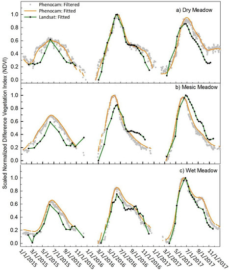 Scaled NDVI values are presented to compare seasonal trends of phenocam and Landsat. Phenocam NDVI (orange) and Landsat NDVI (green) of the sagebrush communities at (panel a) dry meadow, (panel b) mesic meadow, and (panel c) wet meadow.