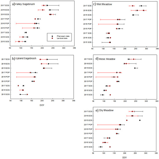 Landsat and phenocam phenophase dates and confidence intervals for: (a) Valley Sagebrush, (b) Upland Sagebrush, (c) Wet Meadow, (d) Mesic Meadow and (e) Dry Meadow. Phenophase dates are start of season (SOS), peak of production (POP), and end of season (EOS) for the years 2015–2017.