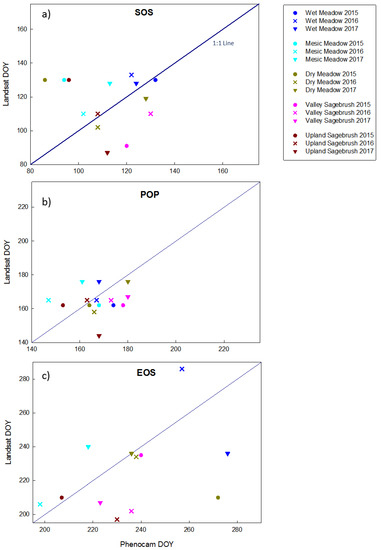 SOS and POP dates agreed reasonably well at the two sagebrush sites as seen by the degree of overlap. For the valley sagebrush, Landsat dates were consistently earlier than phenocam dates. In the upland sagebrush Landsat dates were generally earlier as well, except for SOS in the dry year of 2015, when Landsat SOS was later than phenocam SOS, however in this dry year the best EOS agreement was seen in both upland and valley sagebrush (Figure 8). In general, the three meadow communities had more overlap in extracted phenophases dates, but there were some notable discrepancies (Figure 8). In the mesic meadow there was a consistent trend that Landsat predicted later dates than phenocam (Figure 8). To quantify how Landsat dates varied from phenocam dates we plotted the relationship in relation to a 1:1 Line (Figure 9), the sites were color coded and ordered along an aridity gradient from wetter to drier. A student t-test on the absolute difference determined that the date difference for each phenophase SOS, POP, and EOS, were significantly different from zero (p = 0.004, 0.001, and 0.009, respectively). Because there was no discernible trend of Landsat consistently producing earlier or later phenophase dates in comparisons to phenocams, it was necessary to use the absolute difference of the deviation from the 1:1 line. The mean absolute difference between the two platforms was least for POP (10 days ± 6.5 SD) and greater for SOS and EOS (17 days ± 13.9 SD and 18.8 days ± 14.5 SD, respectively). RMSE calculated assuming a 1:1 relationship with phenocam phenophase dates were 21.8, 11.6 and 28.3 days for SOS, POP, and EOS, respectively. SOS in the dry year 2015 showed considerable variation with Landsat predicting a much later SOS in the dry, mesic, and upland sites (Figure 9). POP showed more agreement between platforms, Landsat produced similar POP dates regardless of community type, which is attributable to the low temporal resolution of the imagery with POP being around the second week of June in the dry and average precipitation years and slightly later in June during the wet year. EOS dates showed the most discrepancies between the platforms. The wet meadow had the greatest agreement between platforms for both SOS and POP. Length of season (LOS) did not show any consistent patterns with in or across sites, with the exception that Landsat phenophase dates produced a consistently shorter growing season for the upland sagebrush site (Supplementary Information, Table S2).