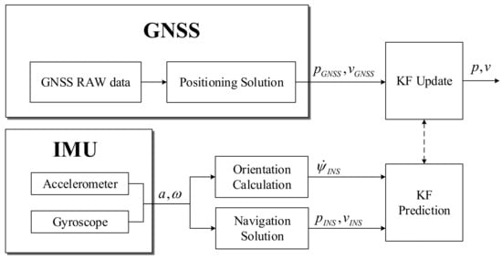 The conventional loose integration architecture of GNSS/INS is shown in Figure 1. The magnetometer is difficult to use in the vehicle with many ironworks due to magnetic field distortion and the difficulties of calibration at the performance levels of MEMS-IMU, although it can be used to obtain orientation. This is why only gyroscopes and accelerometers are normally used to get an orientation. The orientation, position, and velocity calculated using acceleration and the angular rate from IMU are set into the state of the Kalman filter. The Kalman filter is updated using position and velocity data calculated from GNSS.