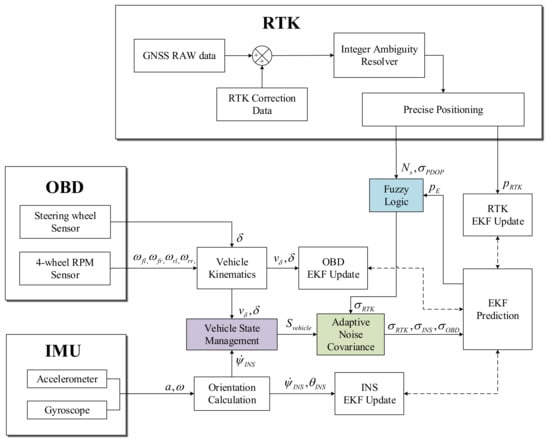The proposed sensor fusion method can be further refined by (1) using the steering angle to compensate the yaw rate and using the velocity calculated from the 4-wheel sensor to substitute the velocity obtained from MEMS-IMU; (2) compensating the heading and changing the measurement noise covariance over the defined driving state; (3) using a fuzzy logic system that adaptively estimates measurement noise based on PDOP, the number of receivable satellites, and the difference between predicted and measured positions; (4) proposing an EKF model that adopts adaptively based on fuzzy logic and the driving state of the vehicle. The proposed sensor fusion system is shown in Figure 2.