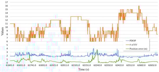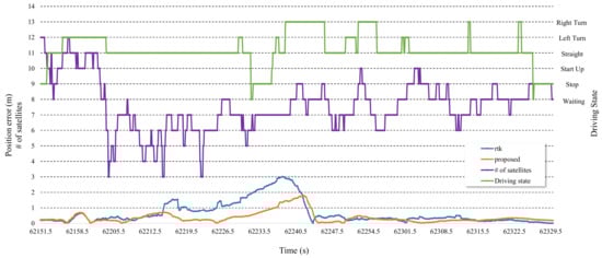 Figure 15 shows the number of receivable satellites, the driving state, and the positioning error of RTK and the proposed system. During this period, the vehicle started, turned left, went straight, then stopped for a while, and then drove and stopped. The number of receivable satellites was high, 10 to 12, in the early period, and it was very low, 3 to 6, in the middle period. It was 6 to 10 in the late period. The positioning error of the proposed system was nearly identical to that of RTK because the proposed adaptive algorithm adds weight to satellite positioning. For the rest of period, the positioning error increased due to the smaller number of receivable satellites. The positioning error of the proposed system was up to over 1.5 meters lower than that of RTK while the number of receivable satellites was low.