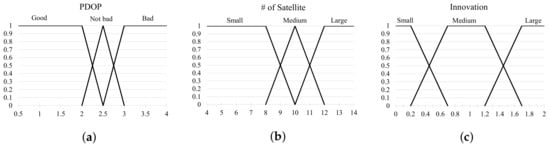 Fuzzy membership function. (a) PDOP; (b) The number of satellite; (c) Innovation.