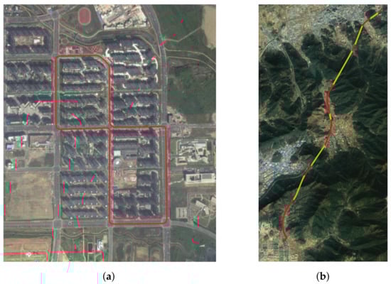 Test trajectory. (a) Scenario I—dense urban area; (b) Scenario II—tunnels (red—roads, yellow—tunnels).