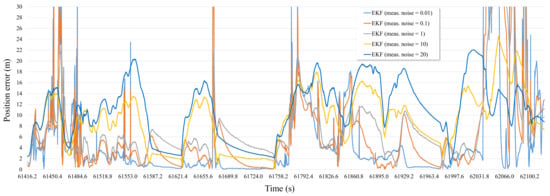 The positioning error of EKF with measurement noise variation in the simulation with raw sensor data.