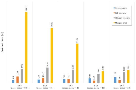 The average, standard, 95th percentile, and maximum positioning errors for the Figure 7 are shown in the Figure 8. As a result, it can be seen that the average position error of EKF with the RTK measurement noise of 0.01 m has better performance than others. However, standard deviation, 95th percentile and maximum position error of EKF with the RTK measurement noise of 0.01 m have relatively high value. As Figure 7 has shown, This is because RTK measurement has a high positioning error probability when the reception condition of the satellite was poor due to obstacles such as buildings and trees. Furthermore, it can be expected that by adjusting the value of the measurement noise matrix according to the interval where the performance of the RTK varies greatly, it can be improved.