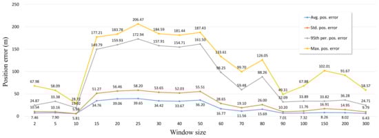 IAE-AKF is the adaptive Kalman filter that changes the measurement covariance matrix according to Equation (1). As shown in Equation (1), averaging is performed with a window size, which causes a performance change. We measured the positioning error of IAE-AKF by changing the window size to investigate the performance change of IAE-AKF according to the window size. The IAE-AKF positioning error results according to the IAE window size are shown in Figure 9. was set to 0.001 m, was set to 0.1 m, and was set to 0.01 m. The IAE window size was set to 2, 5, 10, …, 200.