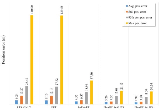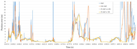 As can be seen from Figure 10, FI-AKF w/o DS and FI-AKF w/DS had relatively low positioning errors compared to EKF and IAE-AKF in the initial section where the RTK positioning error increases. Especially in the region where the positioning error of the RTK rapidly decreased after 61,527.8 s, the FI-AKFs converged to the low positioning error faster than other comparative models. This means that FI-AKFs responds more quickly to changes in the performance of RTK than other comparative models, and it is also set to a more appropriate measurement covariance depending on the situation. The following region also showed a relatively low positioning error compared to EKF and IAE-AKF. The positioning errors of FI-AKF w/o DS and FI-AKF w/DS had generally similar values, and a large difference was observed in the latter half of the experiment.