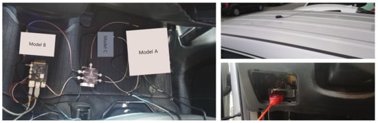 In order to evaluate the performance of the proposed FI-AKF-based real-time positioning system, we compared it with the conventional commercial positioning system in a dense urban environment and in a highway environment including tunnels. Satellite signals input to each positioning system were received by one antenna and distributed through a splitter. The proposed FI-AKF based positioning system was implemented on Raspberry PI. In order to evaluate the performance of each positioning system, references were obtained as detailed in chapter 4. We constructed a field test environment by installing a positioning system in the car, as shown in Figure 12. The scenarios used in the real-time positioning performance comparison experiment are shown in Figure 6a,b.