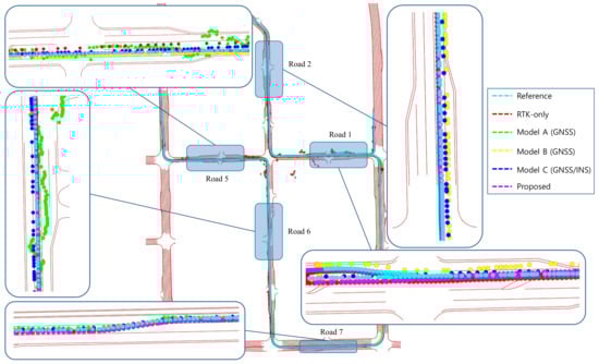 The positioning result of model A is represented by red dots. Model A used less satellites than the other models to position in a situation where the number of satellites in view was not enough. Additionally, model A only output the positioning result at that epoch, because it does not have a dead-reckoning (DR) function. Consequently, model A had a higher positioning error in situations where the number of satellites in view was not enough. Although model B also does not have IMU inside the module, it output a positioning result that reflected the dynamics due to the DR function in situations where the number of satellites in view was not enough. When the previous positioning result was good and the driving state was straight, without INS, which provides accurate directional information, DR showed a relatively low positioning error. On the other hand, when the previous positioning result was bad, DR had a high positioning error, because it is subject to cumulative errors. Model C showed smooth positioning results due to being aided by INS, unlike model A. In dense urban environments, such as scenario 1, because the error of satellite navigation system increases, sometimes the positioning result appears on the other lane. Because the RTK and the proposed system use the correction signals to reduce the positioning error, the positioning error of those is lower than that of other modules using GNSS. However, for road 6, while the RTK result was also far different from the reference, there was no significant difference between the result of the proposed system and the reference.