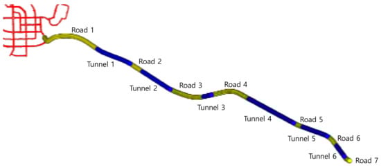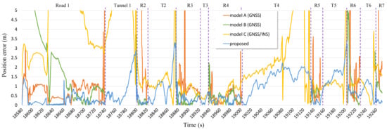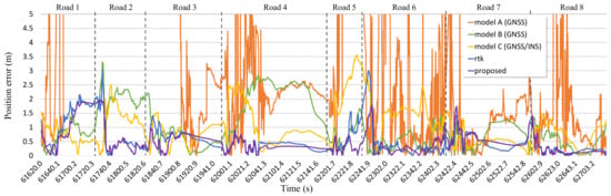 The positioning error of each module over time is shown in Figure 18. The deviation of the positioning error in the scenario involving roads in open sky conditions, unlike scenario 1, was smaller than that in scenario 1. The results of all modules on the roads are shown. Additionally, the results of model C and proposed system in tunnels are shown. In road 1, there is a section that goes outside the urban area that includes the national highway. That is why the positioning error is relatively large as first and get smaller. In all roads after road 1, there was generally a lower positioning error than that in tunnels. In tunnels, because the satellite signals are not received and there is sensor drift, the positioning error gradually increased over time. The satellite signals are not received as the vehicle passes through the tunnel, and then, if the vehicle goes onto the road, it can receive the satellite signals. At this point, time is needed for stable results to occur using a large number of satellite signals. Consequently, on the road soon after the tunnel, the positioning error is relatively large for a period of time.