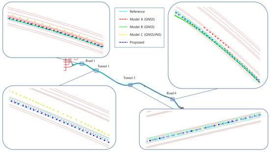 Figure 17 shows the positioning results of proposed algorithm and compares modules in some sections. On the whole, the position results did not departed from the reference. The position of model C outside of the lane was caused by the error that appeared when cornering in beginning periods. The positioning error in tunnel 1 was also large because the signal entered the tunnel without any correction. The satellite signals are disconnected and reconnected as they enter and exit the tunnel. In this process, the error caused by fewer connected satellites was sustained until the positioning system stabilized by receiving more satellite signals. The red dots outside of the lane indicate the results of this process and show a positioning error of over 5 meters from the reference.