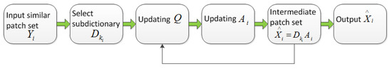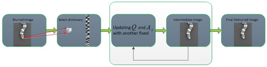 Figure 2 summarizes the main step of the proposed method which is illustrated with a simple input. For each blurred image patch in a blurred image (e.g., patch pointed by two arrows), the index of the dictionary from the pre-learned ensemble dictionary set can be obtained by Equation (2), for simplicity, we only show one atom of the selected dictionary. Then, followed by the procedures described in Section 2, the output can be iteratively optimized until convergence.