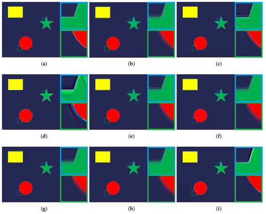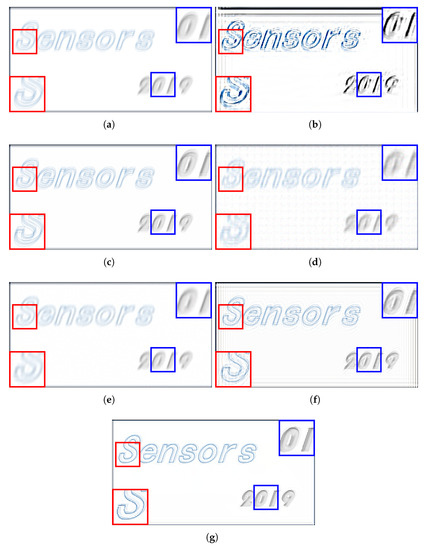 Experimental comparisons using a synthetic image are shown in Figure 6. As shown in Figure 6c,d, the Wiener filter and Xu’s method [33] can better remove blur at the strong edges because minimization of the mean square error and step-edge properties can benefit the process of deblurring. However, they fail to suppress ringing artifacts, especially in areas near step edges. The deblurring result of Shen’s metnod [34] shows that it is difficult for local-contrast based algorithms to handle synthetic image deblurring. Yang’s method [35] and Dong’s method [26] perform better than other compared algorithms in removing blur and suppressing ringing artefacts. However, some other visual artefacts (e.g., noise) can be observed in Figure 6f,g. In Figure 6h, ringing artefacts can be detected in edge areas. It is clear that the proposed method exhibits the highest synthetic image deblurring performance among all compared algorithms.