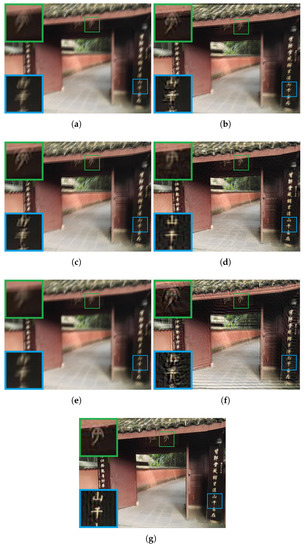 Figure 4 and Figure 5 show two examples of images that suffer from motion blur and continuous defocus blur. Both images were captured by a HUAWEI cell phone. As shown in Figure 4b, there exists ringing artifacts and pixel drift phenomena that lead to a reduction in visual quality. In Figure 4c, although the visual quality is improved in comparison with the original blurry image, the information (e.g., the Chinese characters in the right box) is still difficult to identify. The deblurred result of [35] is shown in Figure 4d. Although the method [35] performs well in identifying some content information, various noise and line artifacts can be found in the output image, resulting in an unnatural visual effect. Motion blur is little removed by Dong’s method [26], as shown in Figure 4e, and detail information is unrevealed. In Figure 4f, although some contents can be recognized, however, the blur effects are less removed (i.e., the Chinese characters in right side of the gate). The proposed method outperforms other algorithms in removing blur and producing results with more complete detail information and fewer artifacts.