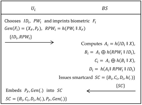 In this phase, the user/agriculture professional registers to the base station . Each user has a which contains a pre-configured identity and a random number . The pre-configured data is also stored in BS’s storage. The is transferred by using physical delivery. As shown in Figure 5, the following steps are executed to complete the registration phase.