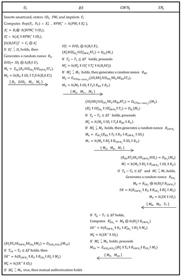 | Step 7: | After getting the message from , firstly verifies if holds. If true, the process continues. Otherwise, the session expires. Then, calculates , and , then checks if . If it holds, the next step proceeds. Otherwise, the session is terminated. |