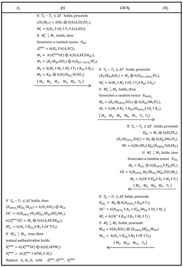 In the proposed scheme, the session key is not related to the master secret key that belongs to the base station . Also, the session key is not related with any shared secret key that exists between legal participants, such as the shared key between and gateway node or the shared key between and sensor node . Instead, the session key is built from each random number that is freshly generated by every legal participant from each session. Therefore, the proposed scheme provides perfect forward secrecy.