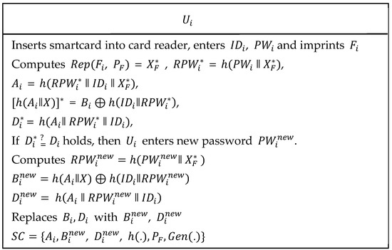 In Ali et al.’s password update or change phase, user modifies his/her password without intervention with the base station. As shown in Figure 4, the following steps were executed to update or change password.