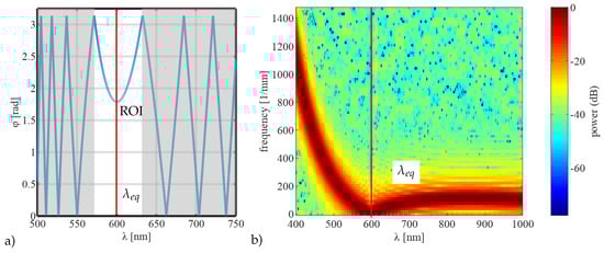 (a) Simulated phase data with ambiguities due to the -operation according to Equation (3) with marked equalization wavelength and region of interest ROI (marked as white band) for the extraction of a local phase and (b) power spectrum as a result from Short-time Fourier Transform (STFT) where the phase minimum is determined and used to define the ROI.
