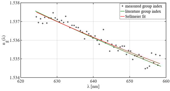 In order to evaluate the algorithm, a sample of N-BK7 ( = 5 mm) was measured. The corresponding group refractive index was calculated and fitted using the Sellmeier equation [], Figure 3.