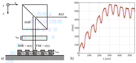 (a) Experimental schematic on a lithographically structured sample of the thickness with varying refractive indices, and , along the x-axis in the SMP—sample arm where the FSR-front surface reflex contains information on the surface height profile due to shrinkage and the BSR-back surface reflex contains information on the refractive index slope along the x-axis in a setup with a dispersive element of the thickness . Probe points for single RDOT measurements are marked with red dots on the sample while REF indicates the reference arm; (b) Plot of the measured surface profile from a polymer sample under investigation utilizing a wavelength-calibrated imaging spectrometer.