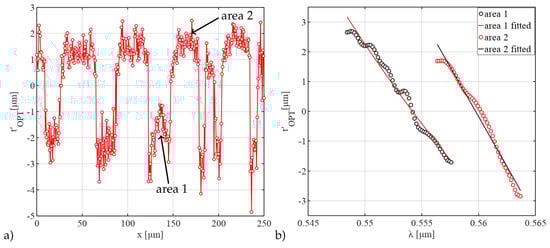 In order to estimate the effect of cross-linking, the RDOT differences as a mean value of two different exposed areas have been measured over the complete spectral range, Figure 5b. An RDOT difference of about 3 m between the differently cross-linked areas could be resolved while the RDOT slope for every area was determined over 10 nm. The results are affected by noise in the original data which gets more pronounced by the process of taking the derivative. Some smoothing using a Gaussian filter was applied to the data.