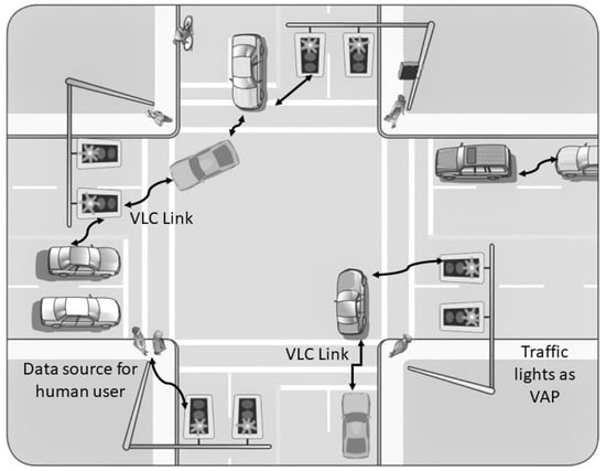 Nearly 1.2 million people die in a traffic-related incident every year, and an estimated 50 million get injured []. Researchers have shown that most of the incidents are due to the slow response and inability of automobile drivers to take the right action at the right time []. In ITS, vehicle to vehicle (V2V) and infrastructure to vehicle (I2V) communication ensures the safety of people, traffic flow and comfort of drivers as shown in Figure 1. ITS relies on reliable, robust and secure communication among vehicle and infrastructure (traffic lights, billboards). VLC is proposed for ITS communication to complement or replace the existing crowded RF-based communication [,]. All vehicles are equipped with head and tail lights that can be used for transmitting information. Traffic lights or billboards can also be used for sharing useful information about the road, traffic and weather conditions. These lighting sources can also be used for providing data connectivity to users and IoE entitites. Căilean et al. have discussed challenges facing VLC in the context of vehicular communication (VC) []. Increasing communication range, enhancing mobility and data rates are the main requirements for VC. The accomplishment of these objectives depends on the ability of communication channels to be resistant to parasitic light (PL). The outdoor channels are exposed to different kinds of PLs. It is observed that VLCs distance measuring and localisation capabilities could be beneficial in VC applications. Further, it is suggested that the development of heterogeneous systems consisting of VLC and dedicated short-range communication (DSRC) (or any other RF-based scheme) could lead to a reliable system for VCs as each of these technologies can make up for each other deficiencies. In this regard, a survey of VLC concerning 5 GHz DSRC in a hybrid arrangement is conducted. It is concluded that VLC systems aimed at VCs can be improved by exploring and integrating new technologies which include but are not limited to software-defined architecture, resource sharing, reconfigurable computing and integration of new materials. Ucar et al. have developed a hybrid 802.11p and VLC secure autonomous platoon system []. The autonomous platoon uses RF based 802.11p and consists of a platoon leader that controls other members to adjust the speeds stably. A 802.11p and VLC hybrid vehicular platoon communication protocol, named as SP-VLC is proposed. This protocol is aimed at addressing security vulnerabilities due to the exclusive use of RF communication. A simulation platform for the vehicle mobility and vehicle platoon managementis is developed. SP-VLC is evaluated under different security vulnerability scenarios. The simulation results validated the observations made in [] that RF-VLC heterogeneous systems can provide many advantages over the RF only system.