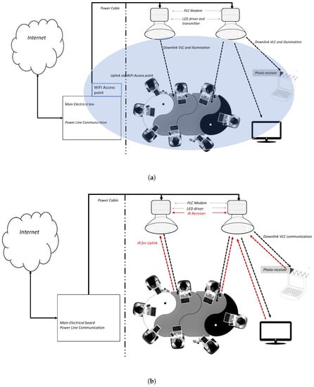 VLC downlink and infrared is used for uplink in VLC Hetnet. (a) VLC downlink and WiFi for uplink in VLC Hetnet. (b) VLC–VLC communication.