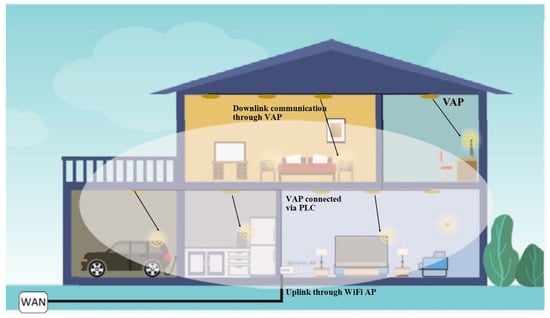 For VLC to provide a fully functional indoor network, it requires connectivity among VAPs and external networks. The easy and straightforward solution is to connect VAP via separate cables. However, this will increase the cost of cabling, installation, labour and design. PLC utilises the already installed electrical power lines for broadband access []. PLC modems are typically plugged into power sockets to provide the interface between data and power network. For over a decade, PLC has been successfully used to transmit radio programs, home automation (remote control of lighting and appliances), home networking, internet access, utility company control switching and automated meter reading [,]. Thus like VLC, PLC has the advantage of having the readily available infrastructure.