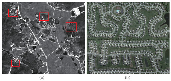 Comparison of the road: in rural region (a); and in urban region (b). The red boxes in (a) indicate some abnormal spectral road regions, where are challenging for road extraction.