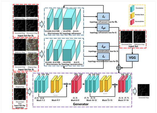 where denotes the kth layer of the pre-trained VGG network, denotes the weight of the kth layer and denotes the m extracted layers. The term is designed due to the powerful ability of VGG to extract features, thus making it better to perceive the road network topology. Then, the generator is trained by the loss :