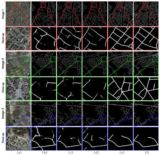 A group of experiments was designed to evaluate how the loss functions of and affect the results. In Figure 3, Column (a) is the input image, Column (b) is the result of the method in [3], Column (c) is the result without the , Column (d) is the result without loss, Column (e) is the result of the integrated network with the initial roads extracted by previous work [3], and Column (f) shows the ground truth. From the results, it was found that the method in [3] lost some salient road structures, thus leading to various “gaps” in the road networks, as highlighted in the red box of Column (b). Without , isolated road fragments were observed since the fine structures could not be captured, as highlighted in the red box of Column (c). Without the loss, some redundant connections or gaps appeared due to the lack of spectral information and the network may fail to correctly connect the fractured topology, as highlighted in the red box of Column (d). While for the proposed approach, the refined road network in Column (e) is much more complete and correct compared with the initial network (b), even when the input images were very challenging for road network extraction.