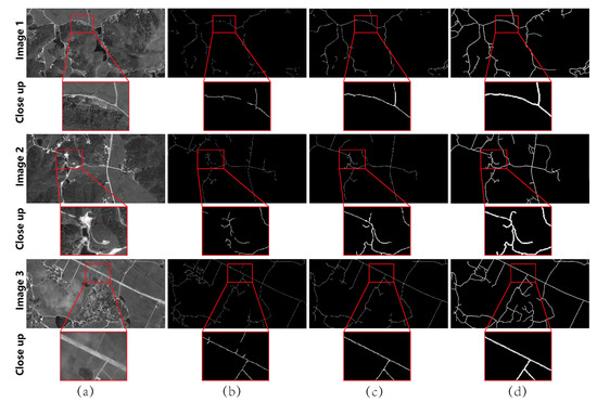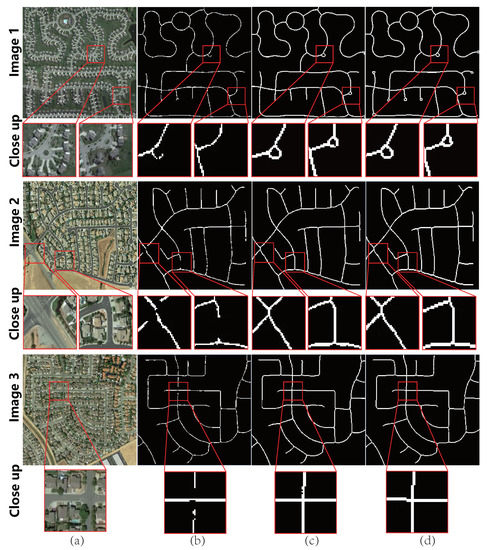 We evaluated how the loss affected the results. Notice that when, we kept the and and removed , the network turned into a Single-conditional GAN (ScGAN), which extracted the road network in an end-to-end manner. We also showed the performance of McGAN on three datasets. The first two, with the resolution of 1 m and 1.2 m, are released by the previous works [11,48], where plenty of rural region roads are involved and the corresponding reference is provided by the datasets. The other dataset, with the resolution of 0.5 m, was captured by Pleiades-1A satellite and the reference is provided by China Transportation & Telecommunication Center.