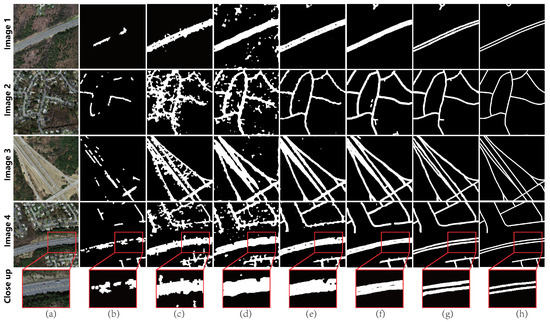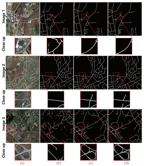 Corresponding statistics are shown in Table 4. It was found that the employed dataset is rather challenging for the road network extraction, and previous approaches [17,22,43,52] performed unsatisfactory, where either the recall was lower than or the precision was lower than (a previous road network extraction work [53] recommends values of 0.6 and 0.75 for recall and precision, respectively, as the baselines for practice). The approach in [11] performed well for this dataset and apparent improvement was observed for the overall F1 score. McGAN performed quite well, where the recall improved by more than 3%, and a 7% improvement for the precision was also observed.