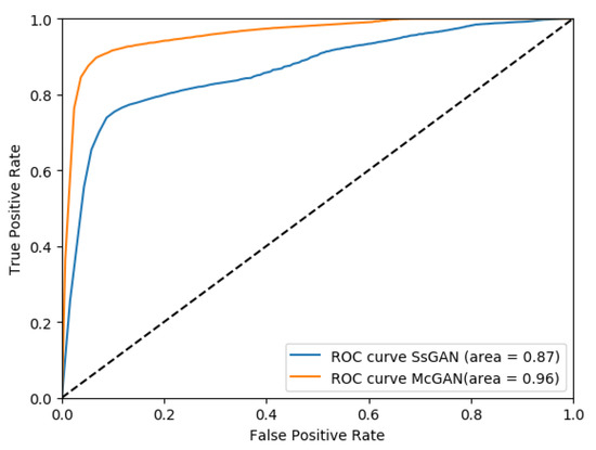 Test on Massachusetts Roads Dataset. Then, the proposed approach was tested on the Massachusetts Roads Dataset. Similar to the last step, the ScGAN was applied to generate the initial road networks. Selected examples are shown in Figure 5, Column (a), and the corresponding initial road networks are shown in Column (b). According to the results, some of the terrain boundaries were misidentified as roads, thus leading to some isolated road fragments. For our result, these road fragments were well removed and the overall F1 score achieved almost 85%. The average quantitative measurements of this dataset are listed in the third row of Table 3. To better show the performance of our method, we also made a Receiver Operating Characteristic (ROC) curve of Image 3 as an example, as shown in Figure 6. For each pixel in the image, we calculated its shortest distance to the true road centerline, which is opposite to the probability of belonging to the road. It can been seen that McGAN had higher precision than ScGAN.