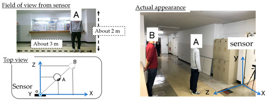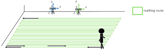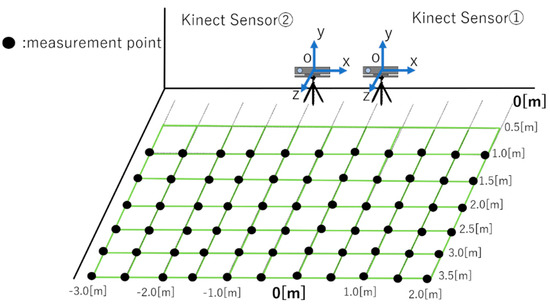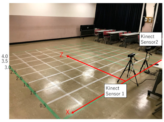 In this experiment, a jig with four sampling points that are not on the same plane for the unification of two Kinect sensors and coordinate system was used [28]. Figure 13 and Figure 14 show the experiment setup. We unify the coordinate system of Kinect Sensor 1 and Kinect Sensor 2, as shown in Figure 13. First, as shown in Figure 13, a jig with sampling points is placed in front of two Kinect sensors, which measure the four-point coordinates of the jig. The simultaneous transformation matrix is calculated based on the coordinates of the four points measured by each Kinetic sensor. Next, one subject stands at a fixed measurement point, and each Kinect sensors measures the subject’s coordinates simultaneously. The measurement result is coordinate-transformed by the calculated coordinate transformation matrix to unify the coordinate system. The total number of measurement points is 66 points. Figure 15 shows the measurement points. Next, we describe the method of processing persons and images programmed. First, each Kinect sensor recognizes the coordinates of sampling points for calculating the coordinate transformation matrix. Infrared rays were then irradiated into the field-of-view of the sensor and the position coordinates of the specified sampling point were measured according to the reflection time, depth information, and color-image information. Based on the coordinates measured using Kinect sensors 1 and 2, the matrix conversion from matrix to expression was performed on all the PCs connected to the two Kinect sensors on the program to calculate the coordinate transformation matrix. Based on the calculated coordinate transformation matrix, the coordinate system of Kinect sensor 2 was unified to the coordinate system of Kinect sensor 1. Therefore, it is possible to link all the information on the coordinate axis of Kinect sensor 1.