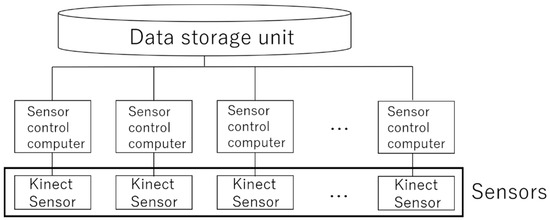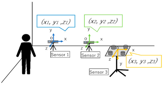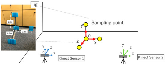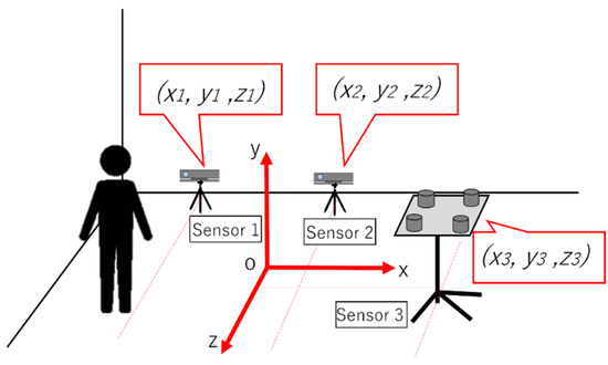 We calculate the coordinate transformation matrix by measuring with n = 4. To unify Kinect’s coordinate system by this method, the point where unified coordinates are known on the real space and can be measured by Kinect (hereinafter, such a point is called a sample point) should be set. Therefore, in this research, the measurement result of the sample point measured by one Kinect (hereinafter referred to as the origin Kinect) is treated as a true value. Then, by substituting the true value and the results measured by other Kinect into Equations (14)–(16), the coordinate system of each sensor can be unified to the coordinates of the origin Kinect. After the calculation of the transformation matrix, each sensor is multiplied by a transformation matrix as shown below for the three-dimensional coordinate measurement result measured by other Kinect Sensor.